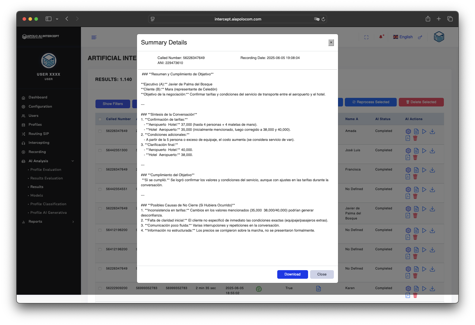 Call summary: Get a real analysis, AI reasons the context and interaction between A and B, identifies if the objective was met "THE GOAL", details the reasons for non-compliance, makes recommendations to interlocutors and generates the report for management.