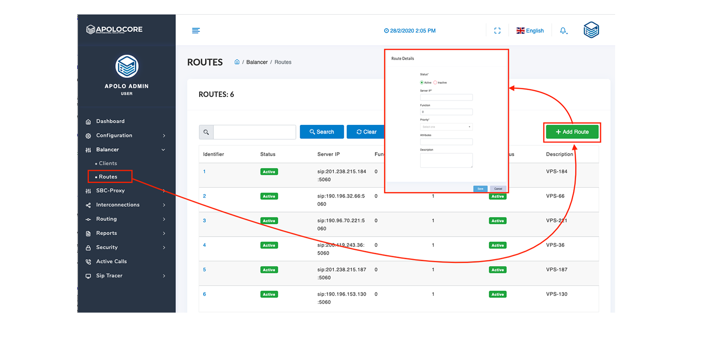 - Click on the interconnection / Core menu and create the elements that can be routed, by entering the Description, IP Address and Prefix fields if necessary. The prefix will be considered as a header for sending calls.