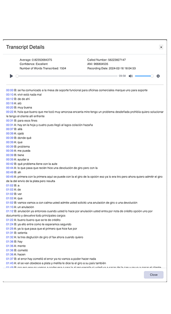 Speech-to-Text Transcription: Instant transcription to text for identification and datagram purposes that combines text with audio in real time for analysis, keywords, and other relevant aspects that allow direct business evaluation.